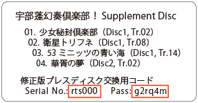 例大祭での頒布の際にお渡ししたCD-R「宇部蓬幻奏倶楽部! Supplement Disc」の封筒の裏面に、それぞれ6文字のシリアルNo.とパスワードを印字しております。